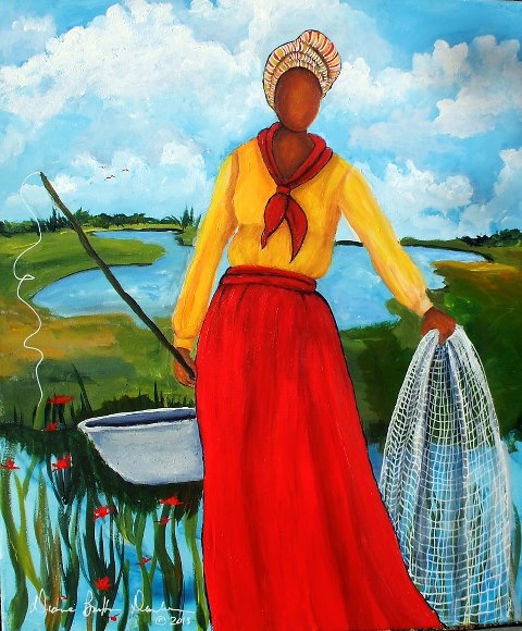 His signature style of using Adinkra symbols subtly in an African dress, a colorful turban or entangled in a shrimp net stimulates the eye to take in every inch of the canvas. Deep, engaging layers invite you to look deeper into the painting, where empowering images and colors dance across the canvas in an energetic display of expression. Amiri states, “The Gullah Geechee people have preserved much of their African cultural heritage. It is very important that we tell the history of this unique sea island culture.”